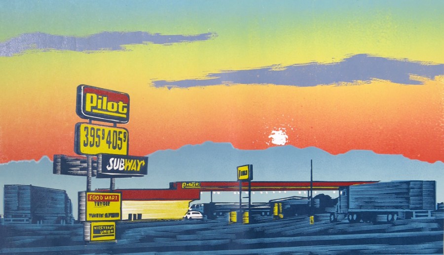 Truck Stop, 2008; woodcut; image: 265×456 mm