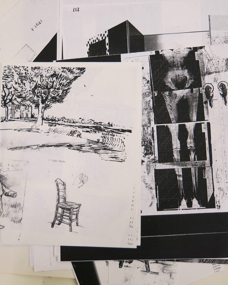 A sample of the 40 or more printouts and copies used in generating imagery for Cunningham’s lithograph, Rauschenberg vs. Van Gogh: Who Can Build a Better Chair?, 1998.