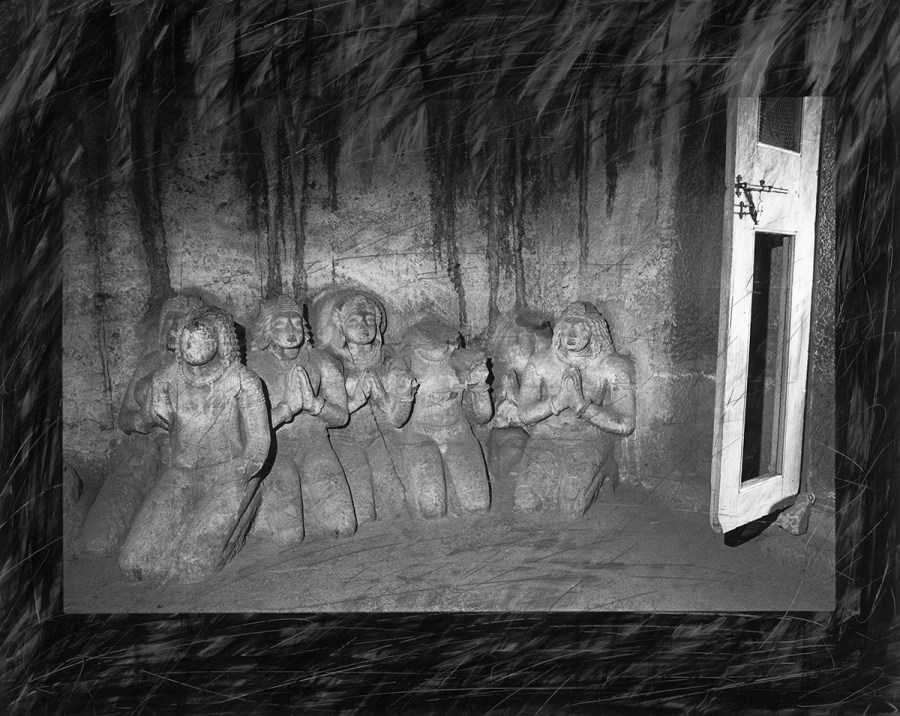 Kneeling Figures, Buddhist Caves near Aurangabad, Maharashtra, India, 1988-90; silver gelatin print with graphite