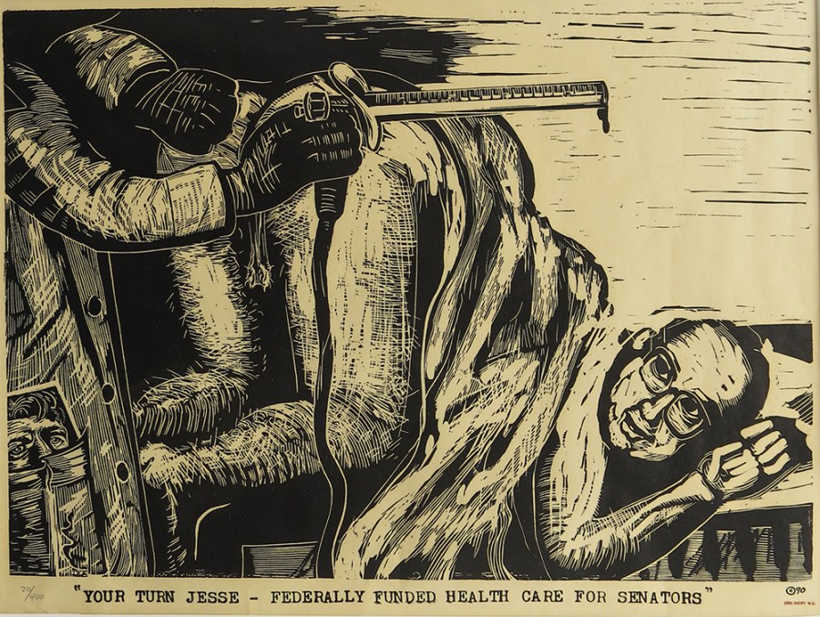 Eric Avery; Your Turn Jesse – Federally Funded Health Care for Senators, 1990; linocut (343x466mm)