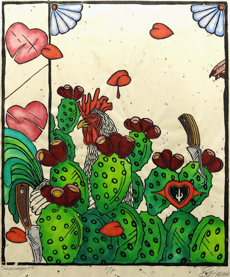 Rudy Fernandez; Indictment, 1984; woodcut with hand coloring (552x477mm)