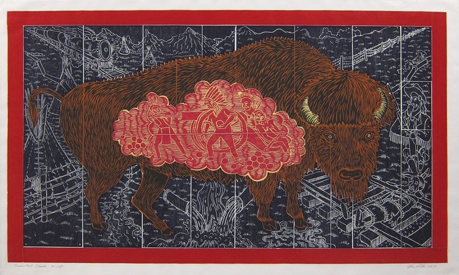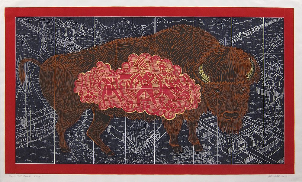 John Buck, Cannonball Creek, 2017; woodcut (648x1022mm)