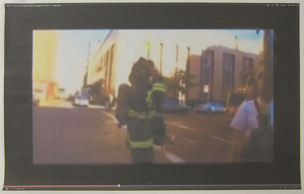 Andrew Super; screenshot of a video of the World Trade Center attack, 2013; inkjet