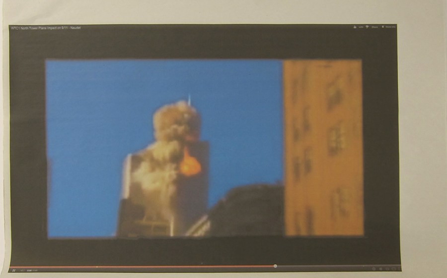 Andrew Super; screenshot of a video of the World Trade Center attack, 2013; inkjet