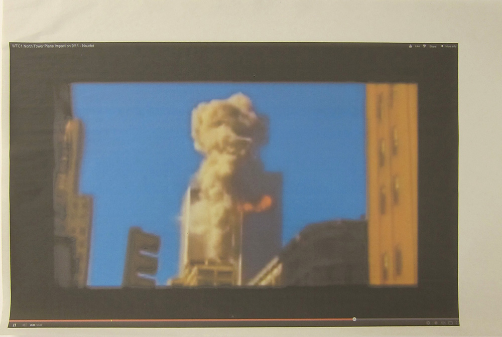 Andrew Super; screenshot of a video of the World Trade Center attack, 2013; inkjet