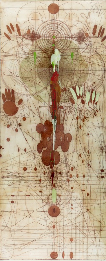 Judy Pfaff, The Mirror, 1998; etching, surface roll, encaustic, dye (72×32 inches)