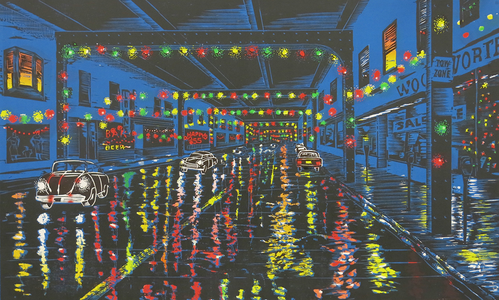 Anthony Lazorko (1935-2017); Xmas Eve on the Ave, 2015; woodcut (460x610mm)