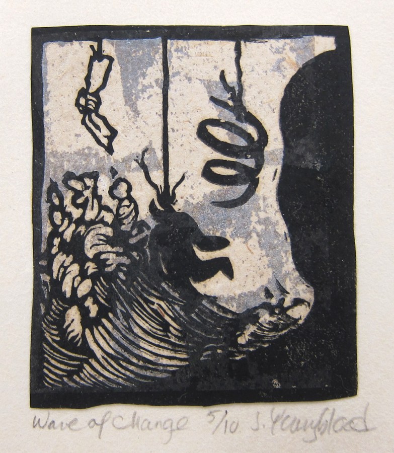 Judy Youngblood; Wave of Change, 1994; linocut, metal leaf (95×82 mm)