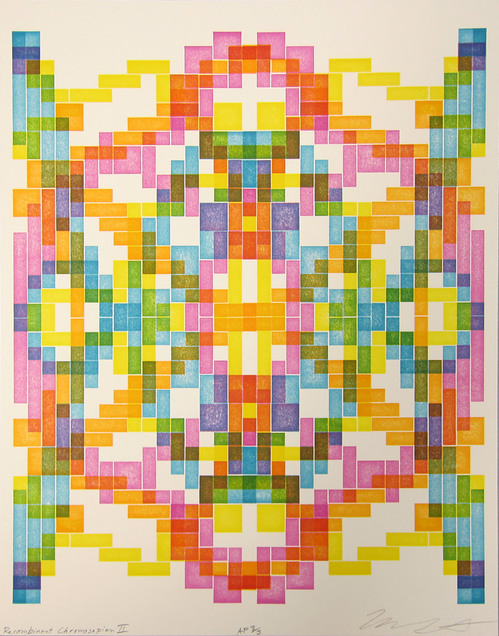 Michael Sonnichsen; Recombinant Chromosapien II, 2018; Lego letterpress relief (320×264 mm)