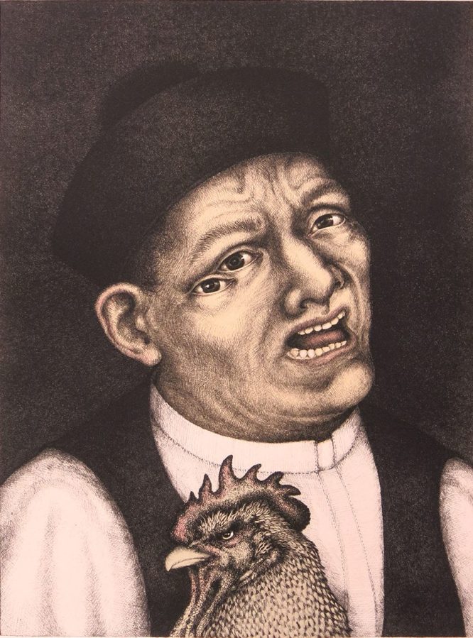 Julie Speed; Man with Cock, 2015; etching, polymer plate, hand coloring (401×301 mm)