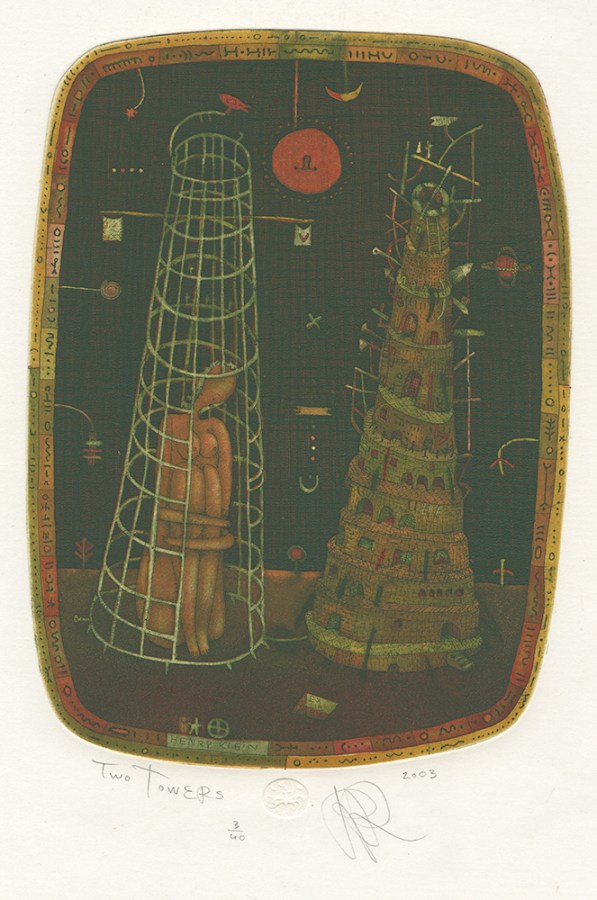 Roman Romanyshyn (born 1957, Ukrainian); Two Towers, 2003; etching, aquatint, mezzotint; 228×191 mm