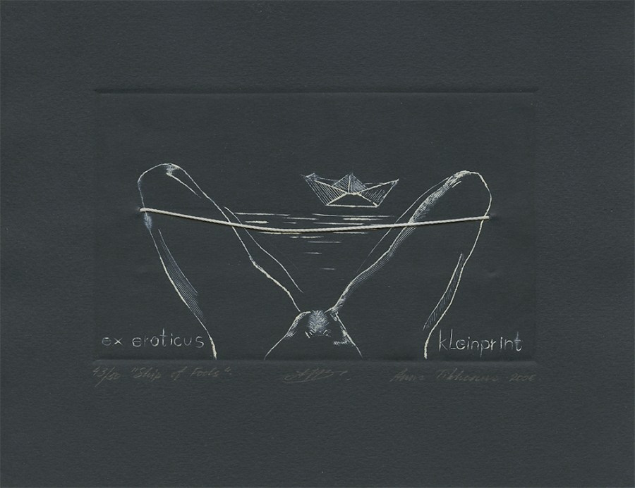 Anna Tikhonova Jordanova (born 1977, Belarusian residing in Bulgaria); Ship of fools – ex eroticus kleinprint, 2007; engraving, roulette on plastic with string; 90×145 mm