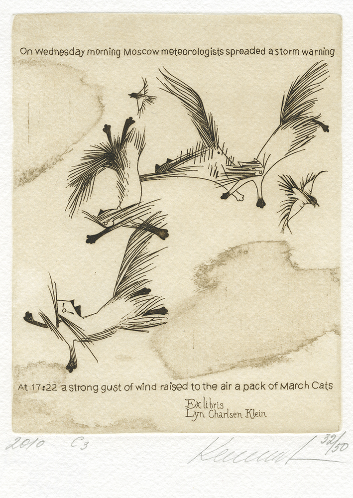 Olga Keleinikova (born 1953, Russian); March Cats – ExLibris Lyn Charlsen Klein, 2010; etching; 138×106 mm