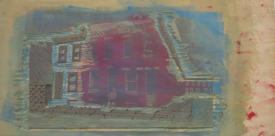 Anthony Lazorko (1935-2017); Stoop Sitting in Philly, 2007; wood, ink (305x616mm)