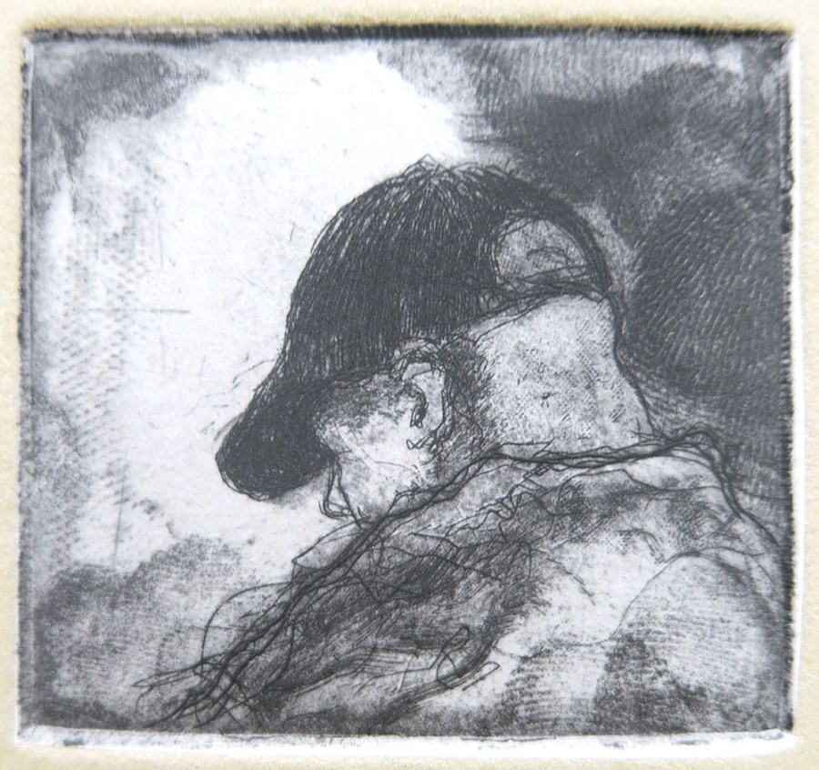 Ellen Verdon Winkler; Study of a Man, 2018; etching, soft ground, dry point, chine colle; 50x52mm