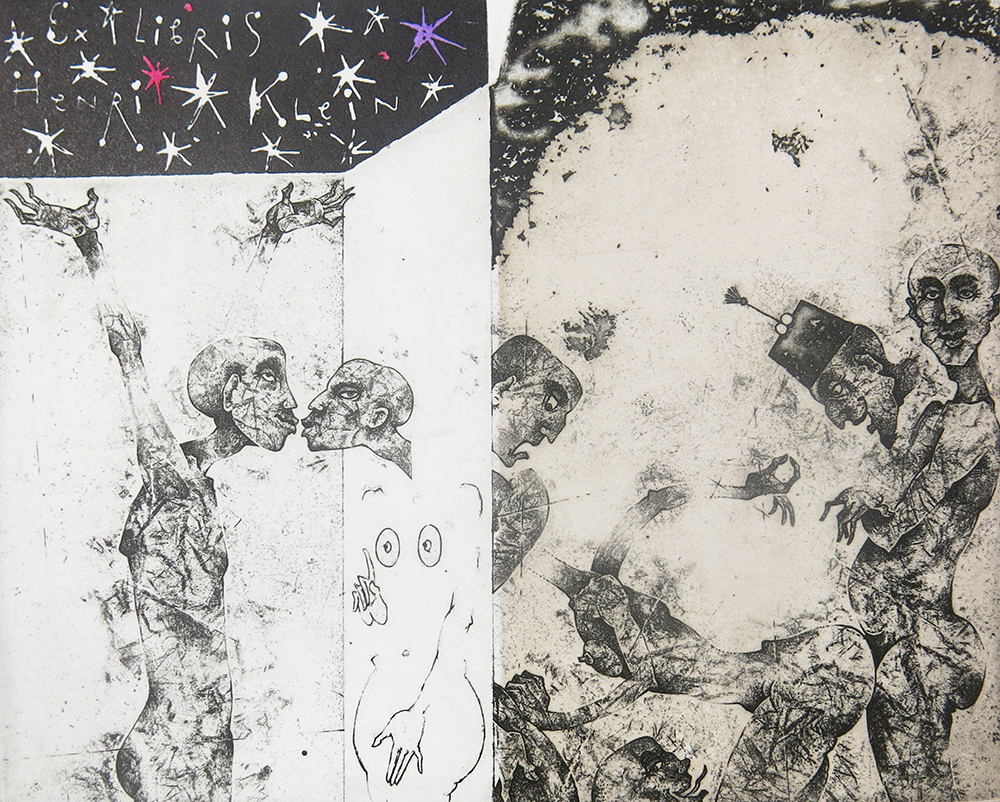 Vladimir Zuev (born 1959, Russian); Fool for Love (Kiss and Tell) – Ex Libris Henry Klein, 2013; etching, aquatint, relief etching, hand coloring; 118×146 mm