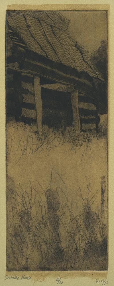 Ellen Verdon Winkler; Smoke House, 2018; etching, soft ground, dry point, chine colle; 250x100mm