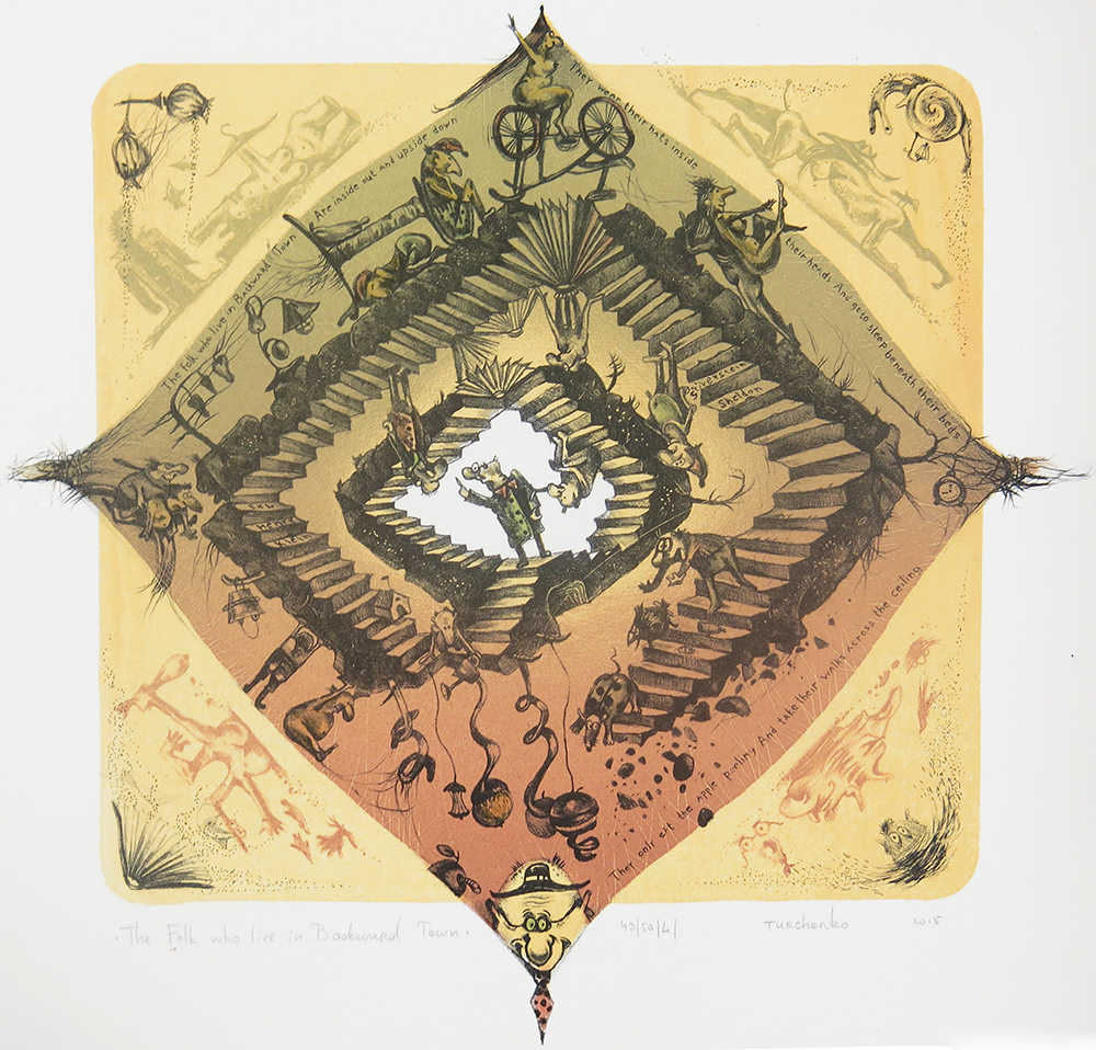 Ulyana Turchenko (born 1980, Ukranian); The Folk who live in Backward Town. Sheldon Silverstein – EXL Henry Klein, 2015; lithograph; 219×230 mm