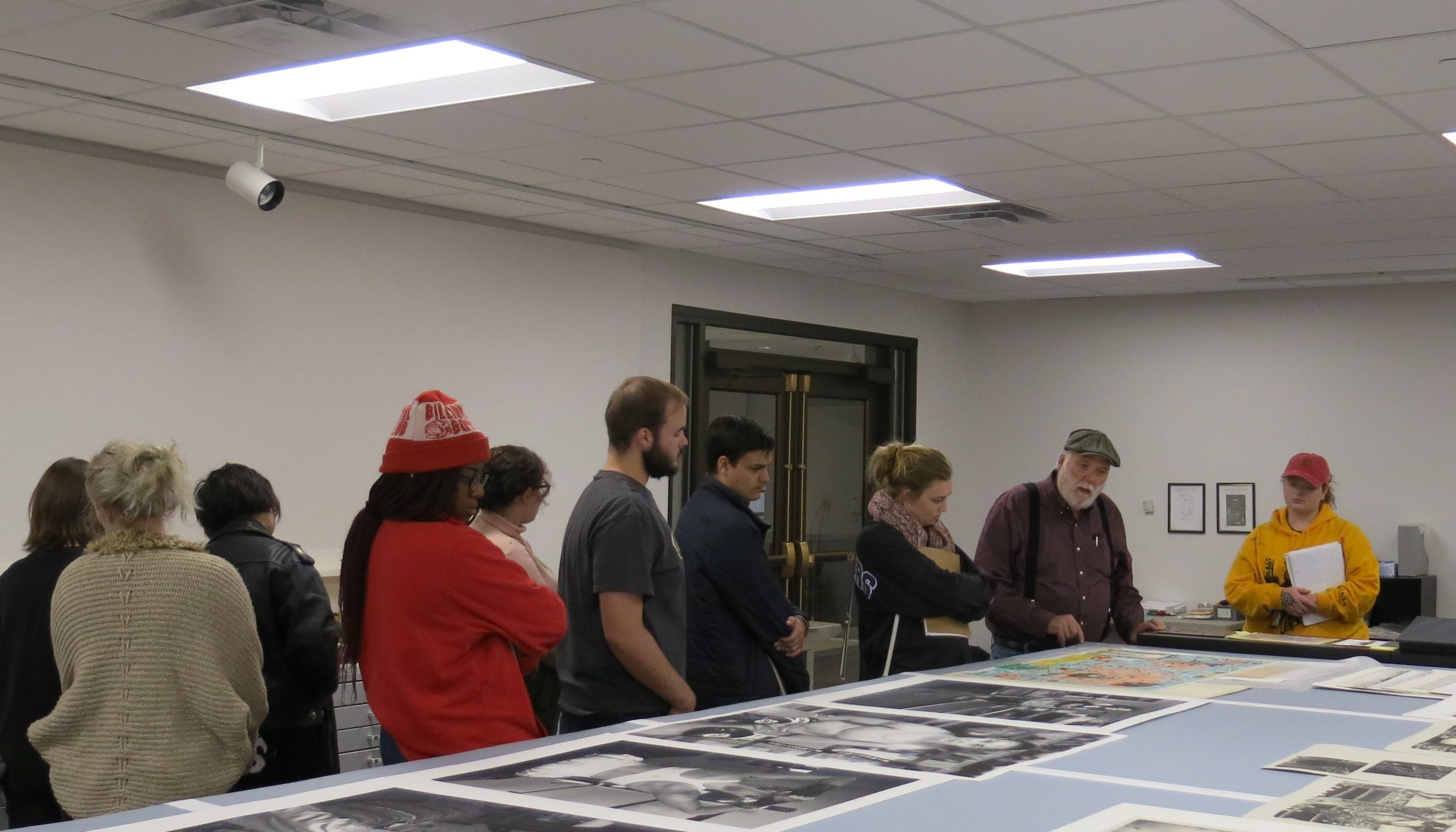 Peter Briggs, Curator of Art and founder of the AP/RC talking about a print by Enrique Chagoya with a Latinx art history class.