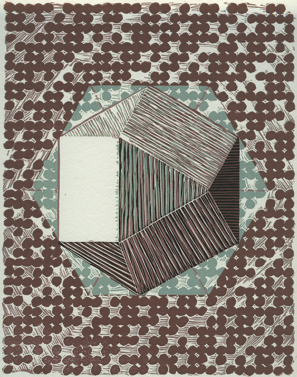 Neal Cox; Truncated Cube, 2017; Reduction linocut; 280mmx353mm; Edition 8/9