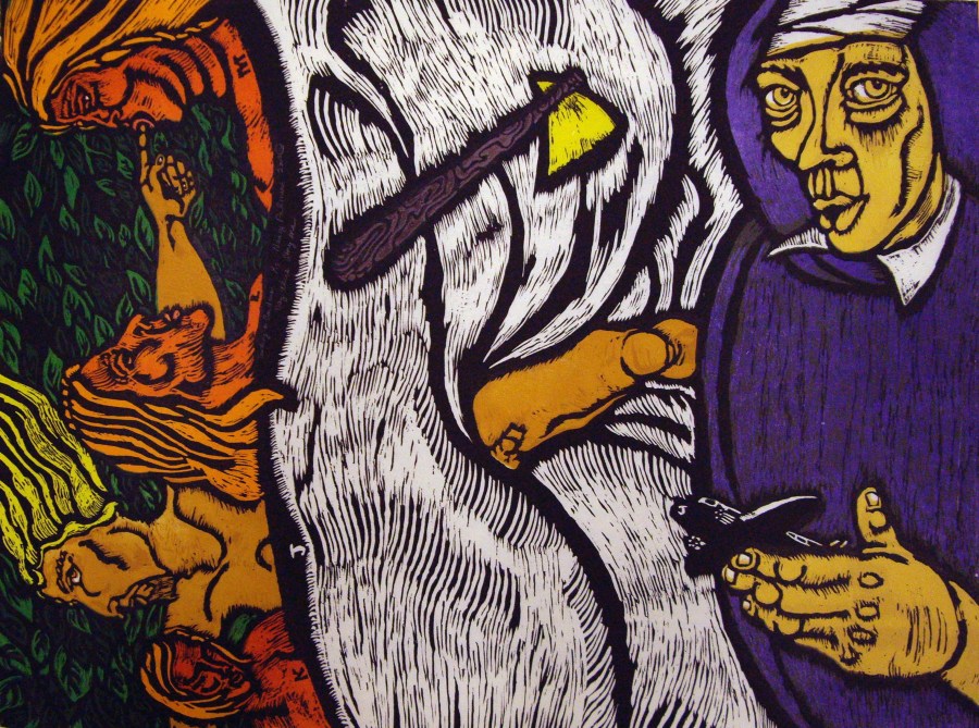 Tending to Gardens Day Three Story One, 2002; Woodcut; Image: 22 x 16 inches