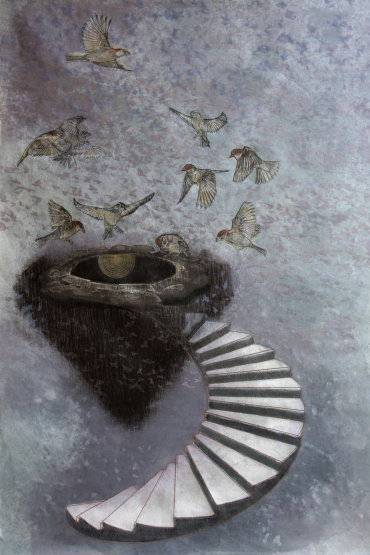 Spiraling, 2011; Laser engraved wood relief, silkscreen, monotype printed on handmade paper; Image: 18 x 32 inches